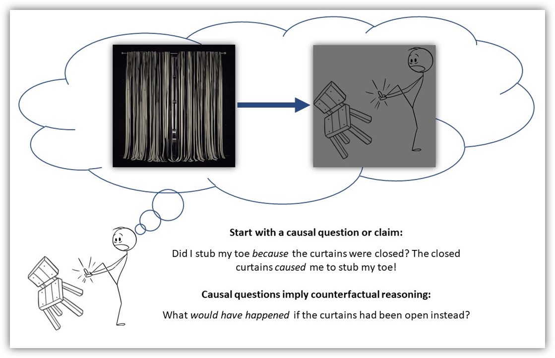 There are two important things to note about this imaginary angry thought. First, it communicates a causal belief or claim. Specifically, your momentary thought communicates a belief that the closed window curtains are (at least partly) responsible for you stubbing your toe. Put differently, you view the closed curtains as a cause of the undesired outcome - perhaps not the only cause, but a noteworthy cause nonetheless.
