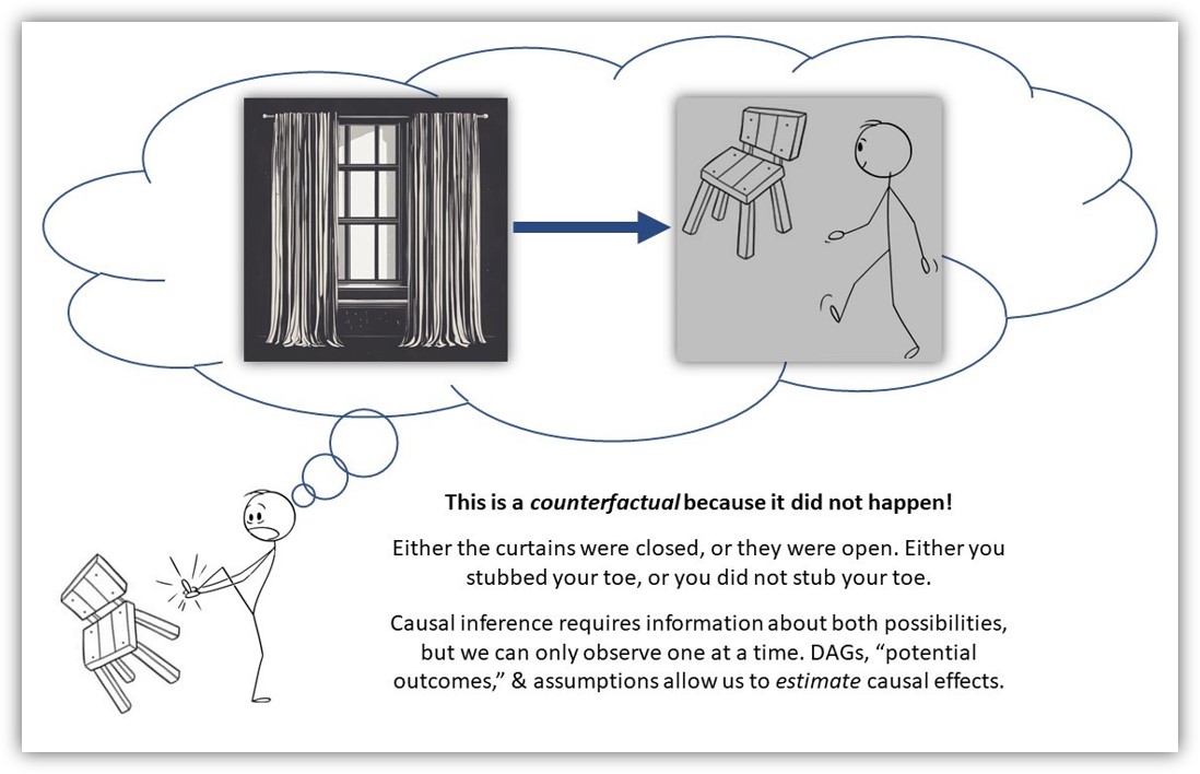 Second, the structure of this angry thought conveys an implicit view of causal claims as dependent upon contrasts between plausible “potential outcomes” across observed and “counterfactual” conditions. That is, your momentary thought contrasts an observed or factual initial condition (the closed curtain) with a counterfactual initial condition (an open curtain), and then implies a different potential outcome (i.e, a stubbed versus an unstubbed toe) might have occurred if the observed initial condition would have been changed to the counterfactual condition instead.