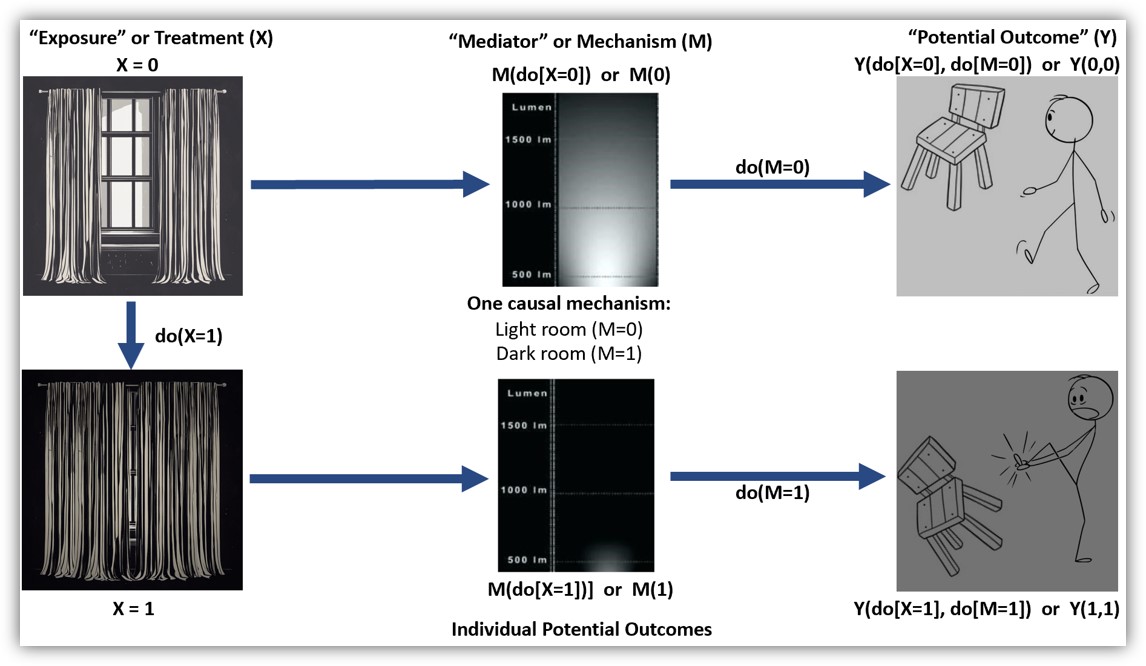 Now, let’s step back and revisit our causal assumptions. Do we really think the closed curtains directly caused us to stub our toes? When interrogating a causal claim, it is usually a good idea to ask “how” and “why” questions, as doing so might illuminate mechanisms that can help us better identify, predict, and explain causal relationships. For instance, why do we think the closed curtains caused us to stub our toe? How might the closed curtains have caused such an outcome to occur?
