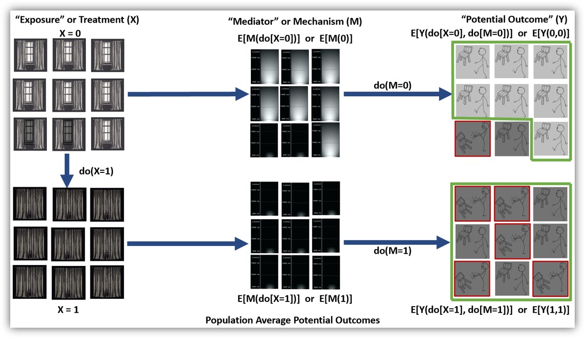 My primary goals in this second post are to introduce counterfactual causality, exposure-mediator interactions, and a potential outcomes framework for conducting a four-way decomposition of a total effect into four distinct components: a controlled direct effect (CDE); a pure indirect effect (PIE); a reference interaction (INTref); and a mediated interaction (INTmed).