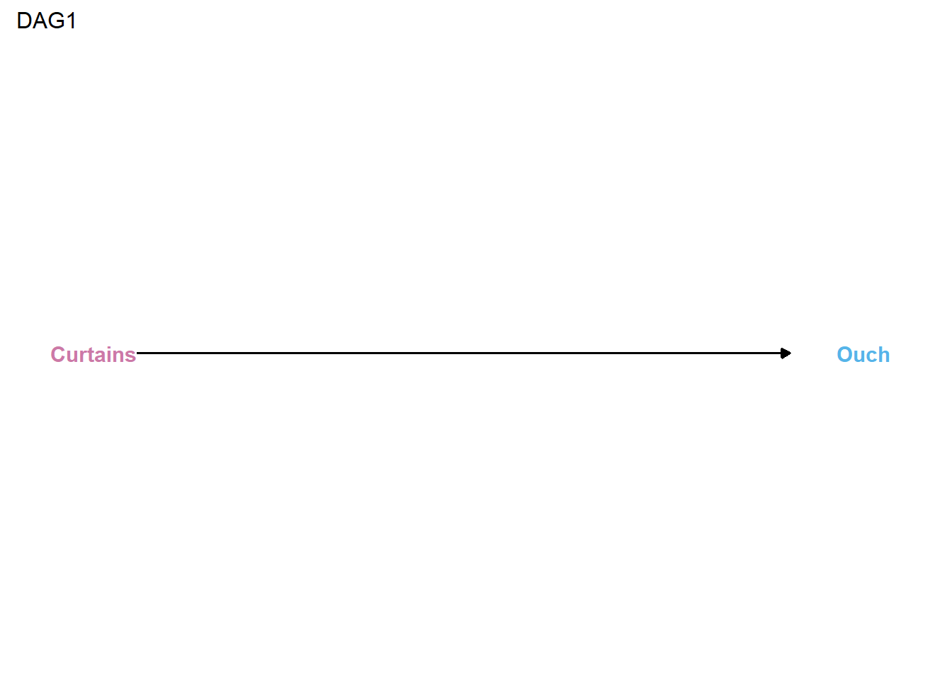 Additionally, as we have explained before, it is usually helpful to communicate our causal assumptions transparently using a causal diagram or a DAG. In the DAG below, we collapse our exposure conditions and potential outcomes into two variables connected by an arrow to represent our expectation of a causal relationship between curtains (open versus closed) and uttering a four-letter word (unstubbed versus stubbed toe).