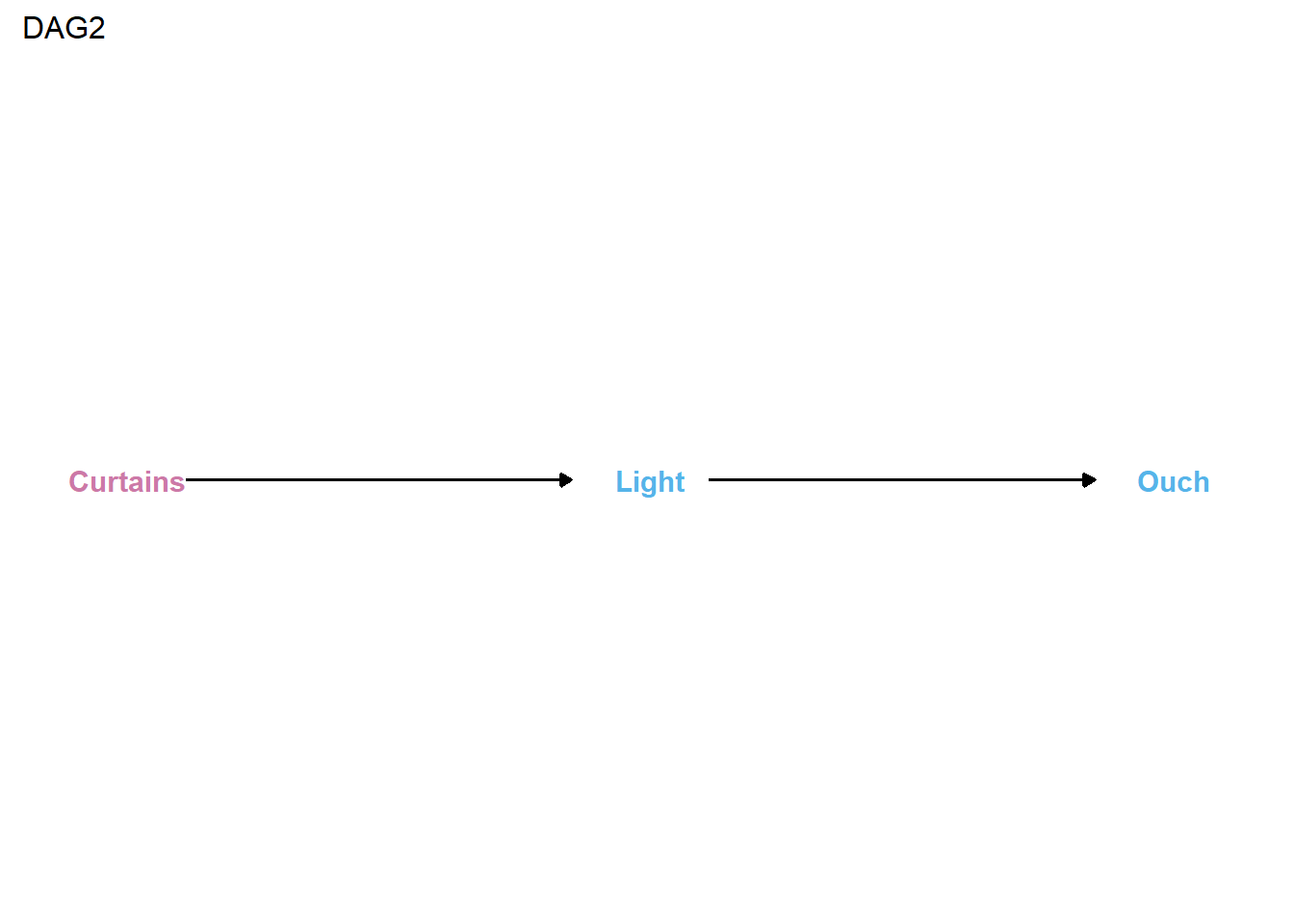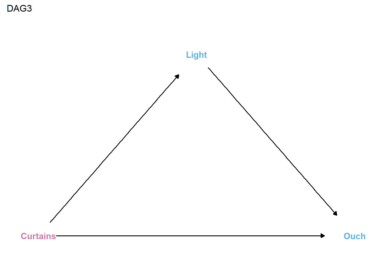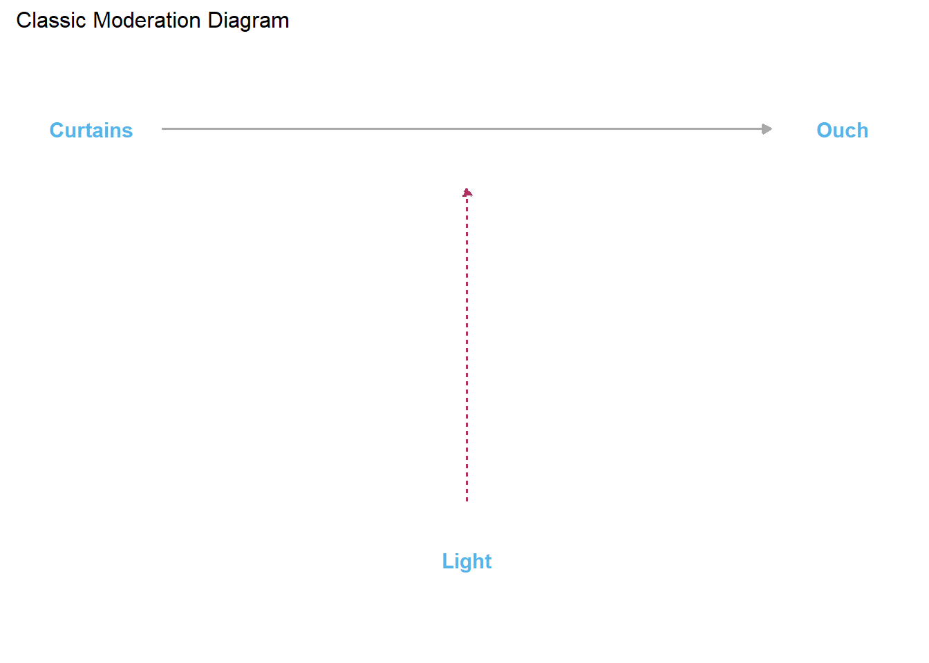 After examining this DAG, many of you might immediately assume it that it displays a classic indirect causal effect or mediating relationship. However, it is worth taking a moment to ponder whether you think light really is a mediator, or instead whether it is a moderator, or perhaps both? For example, consider that opening the curtains might reduce the chances of stubbing your toes when it is light outside and, hence, when doing so lets sufficient light in the room for you to see obstacles in your path. In contrast, when it is not light outside, opening the curtains might not let sufficient light in and, in those situations, opening the curtains (i.e., doing X=0) might not reduce (i.e., cause) the probability of stubbing toes.